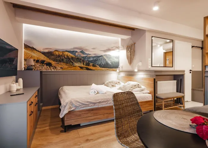 Das Gorskie Szczyty Apart & Spa Apartament 6 Sauna Jacuzzi I Parking W Cenie Zakopane liegt circa 25 Gehminuten von der Herz-Jesu-Kapelle entfernt und bietet tolle Wellnesseinrichtungen, darunter ein Jacuzzi und eine Sauna. Dieses Apartment liegt 3 km vom Tatra-Nationalpark in Zakopane.